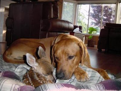 “A lady found the fawn under her step (they think the doe might have been hit by a car), her RidgeBack dog is helping look after it.