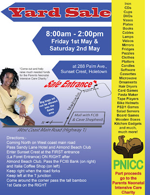 There’s a big yard sale this coming weekend, Fri 1st & Sat 2nd May to raise fund$ for the NICU. NICU) is a highly specialized ward at the QEH where premature and sick babies born in Barbados, and many of the other Caribbean islands are cared for.Thanks to the generous support of the parents, staff and the community, the Parents NICU Charity continues to provide supplies, new equipment, training, and maintenance programs to ensure the highly technical machines are kept in good working order at all times!